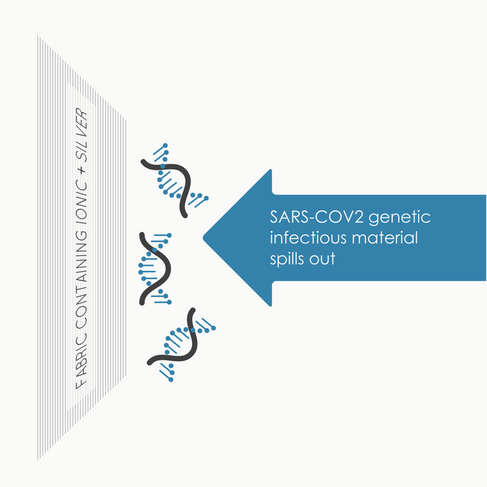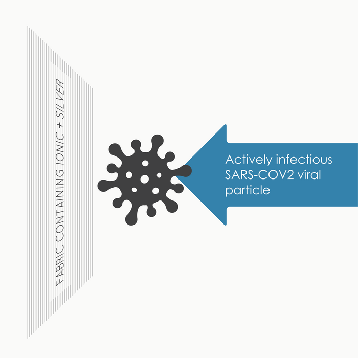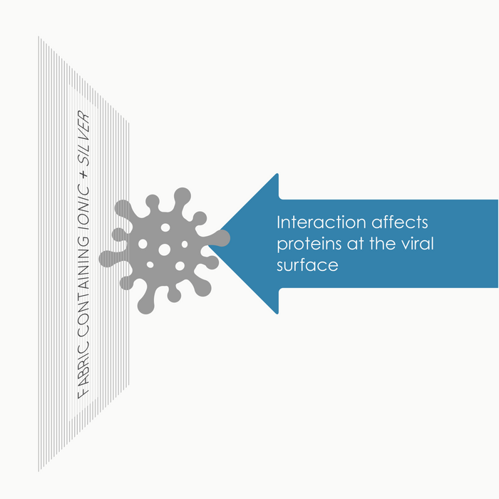 Silver particles and/or silver ions, which are Present in the Fabric, interact with the virus on contact.